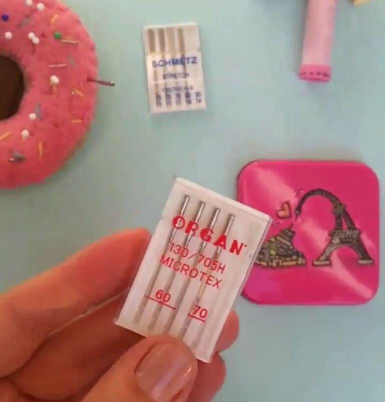 Obecně mám při šití podprsenky dobré zkušenosti s použitím jehel typu Stretch nebo Mixrotex v síle podle šitých látek. Velikost 70 používám na velmi jemné vrstvy látky (podšívka, krajka) a velikost 90-100 na šití ramínek a zapínání.