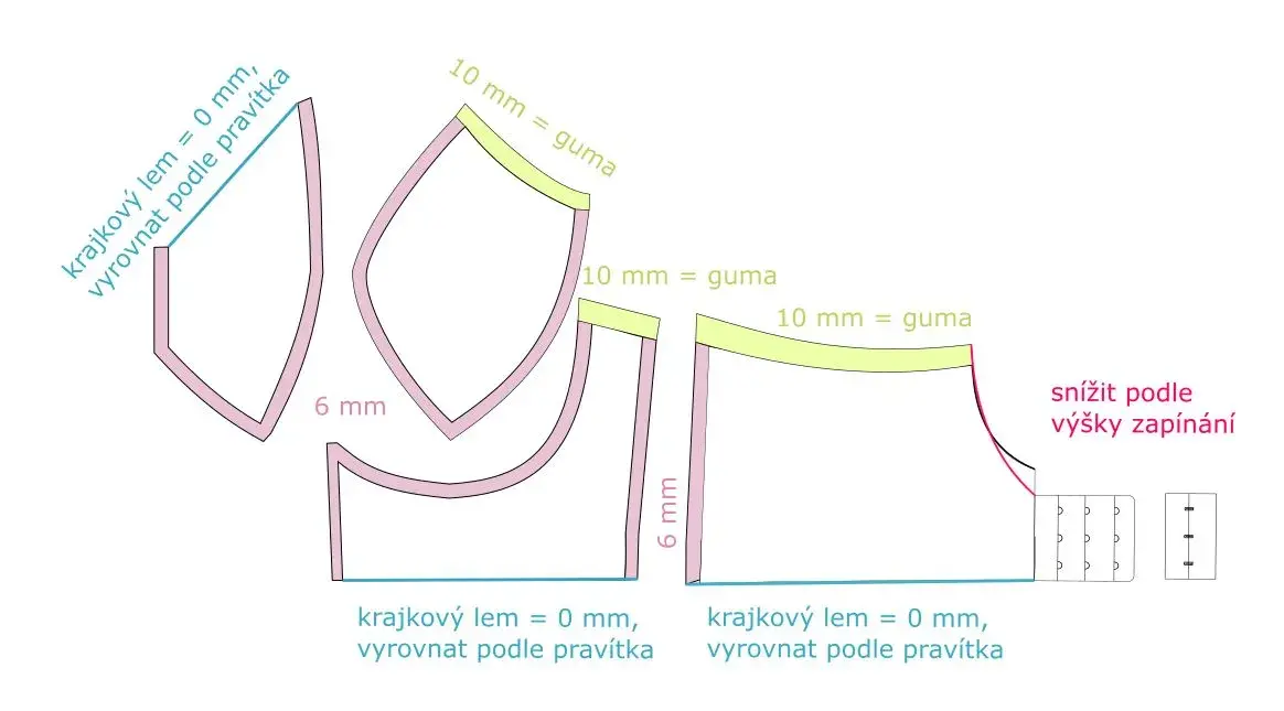 Abychom mohly použít krajku s dekoračním okrajem a abychom mohly našít podprsenkovou gumu, potřebujeme mírné úpravy střihu a hlavně vhodné přídavky podle krajkových lemů a gum.