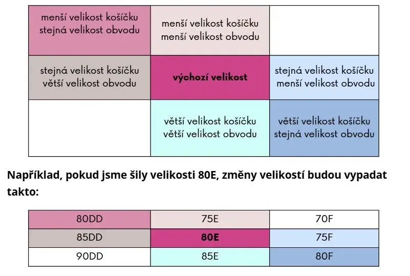 - Příště si vyber velikost ze stejného řádku velikostní tabulky, s menší velikostí košíčku na větším obvodu (posun v tabulce o 1 políčko doleva). Obvod je potom potřeba upravit na původní hodnotu. Změnu velikosti doporučuji vždy o 1 velikost. Vybíráme tedy v rámci sesterských velikostí. Pokud si nevzpomínáš, co jsou sesterské velikosti, podívej se na video o podprsenkovém číslování z 1.týdne.