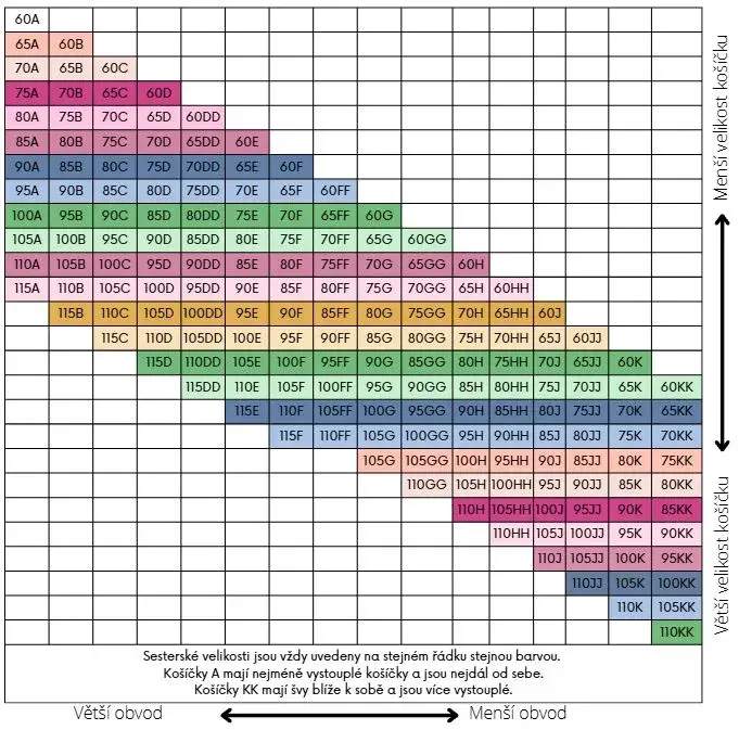 - Příště si vyber velikost ze stejného řádku velikostní tabulky, s větší velikostí košíčku na menším obvodu (posun v tabulce o 1 políčko doprava). Obvod je potom potřeba upravit na původní hodnotu. Změnu velikosti doporučuji vždy o 1 velikost. Vybíráme tedy v rámci sesterských velikostí. Pokud si nevzpomínáš, co jsou sesterské velikosti, podívej se na video o podprsenkovém číslování z 1.týdne.