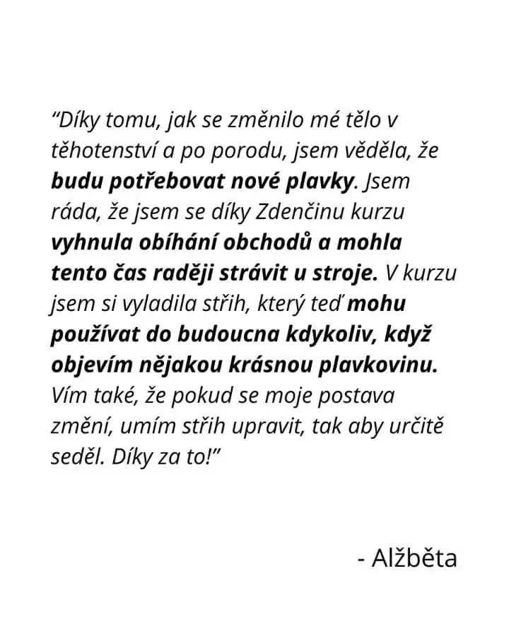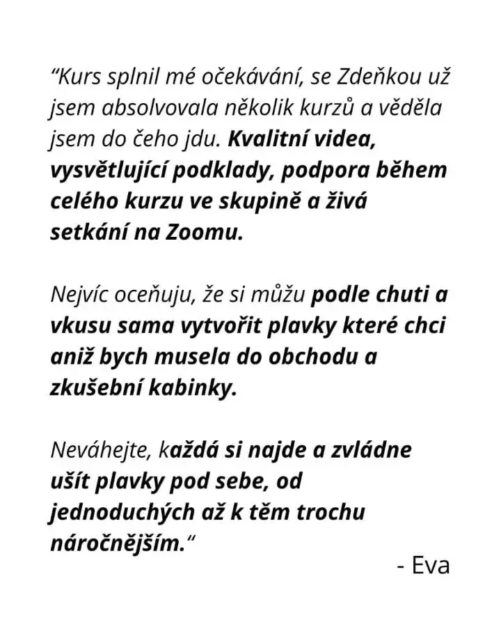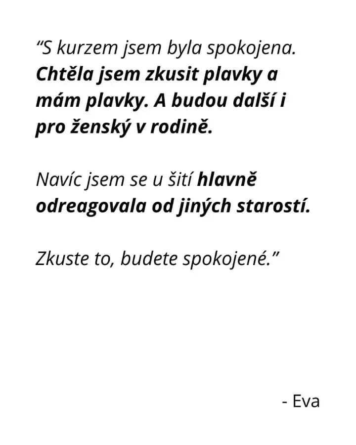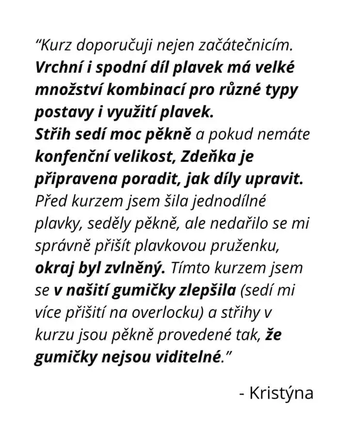 Já si přeji, aby se každá žena cítila ve svém těle sebevědomě i na koupališti či na pláži a mohla si léto užít na maximum. Díky kurzu si takové plavky navrhneš přesně na míru a také se můžeš vyvarovat chybám, které jsem už udělala za Tebe. Ty jen přijdeš a rovnou se můžeš pustit do šití!